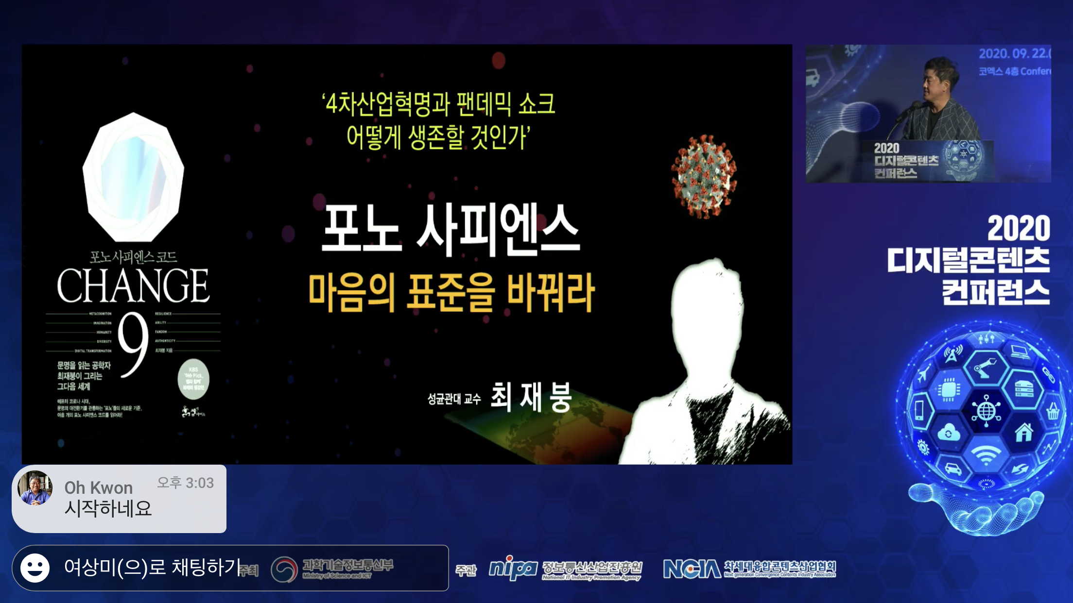 09월 22일 온·오프라인 동시개최된 '2020 디지털콘텐츠 컨퍼런스'에 온라인으로 참석하게 되었다. 사전 참여 신청 후, 접속 링크를 받아 클릭하면 유튜브를 통해 실시간 스트리밍으로 강연을 들을 수 있는 시스템이었다. ‘코로나19’로 인해 많은 강연들이 애플리케이션, 실시간 라이브 방송 등으로 진행된다는 것을 익히 알고 있었지만, 직접적인 참여를 해본 첫 소감은 생각보다 오프라인 행사와 ‘이질감이 없어 놀랍다’는 점이었다. 실시간 방송이다 보니 끊김 현상이나 화질, 음향 등의 기술과 기기상의 문제들에 대해 염려했었는데 그건 아마도 오프라인 강연 방식에 익숙해진 내 사고의 문제가 더 크지 않았을까 생각했을 정도이다. 어쩌면 오프라인 강연보다 더욱 생생했고, 몰입도가 높았던 라이브 컨퍼런스는 기대 이상으로 앞으로를 살아갈 세대들에게 많은 팁을 제공하는 계기가 되었다.