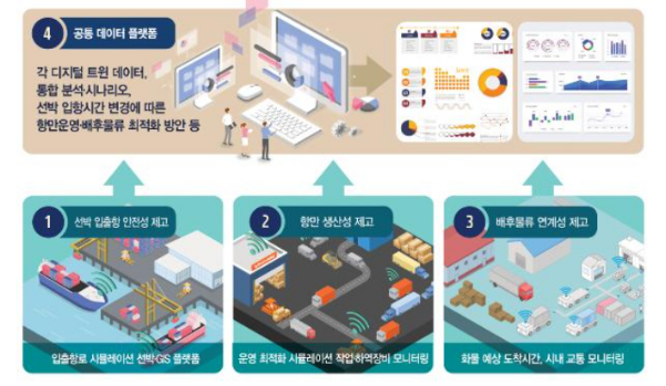 부산항에서 진행되는 항만 디지털 트윈 기술 적용 계획에 따르면, ICT 기술로 실제 부산항과 동일한 가상현실을 구현하고, 선박 입출항 경로·시간·접안선석 변경 등 항만운영과정에서 발생하는 여러 상황에 맞춰 터미널 운영사, 운송사 등 다양한 이해 관계자들이 최적화 의사결정 할 수 있게 지원하는 통합 플랫폼을 구축할 전망이다.