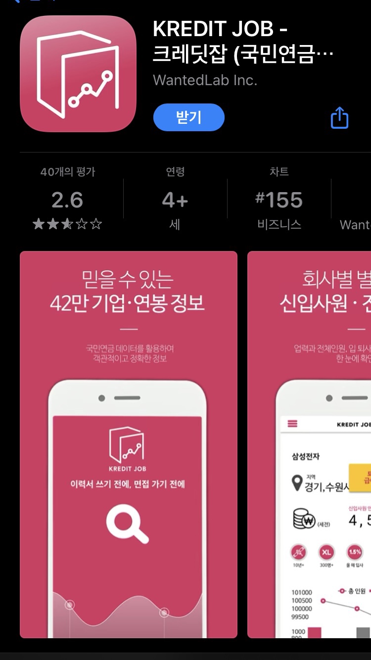 마지막으로, ‘크레딧잡’이 있습니다. 애플리케이션 및 홈페이지를 통해 구직자 대상 원하는 기업의 객관적이고 신뢰성 높은 정보를 제공합니다. 국민연금공단 공공데이터를 활용하여 기업의 고용정보를 알려주고 있습니다.