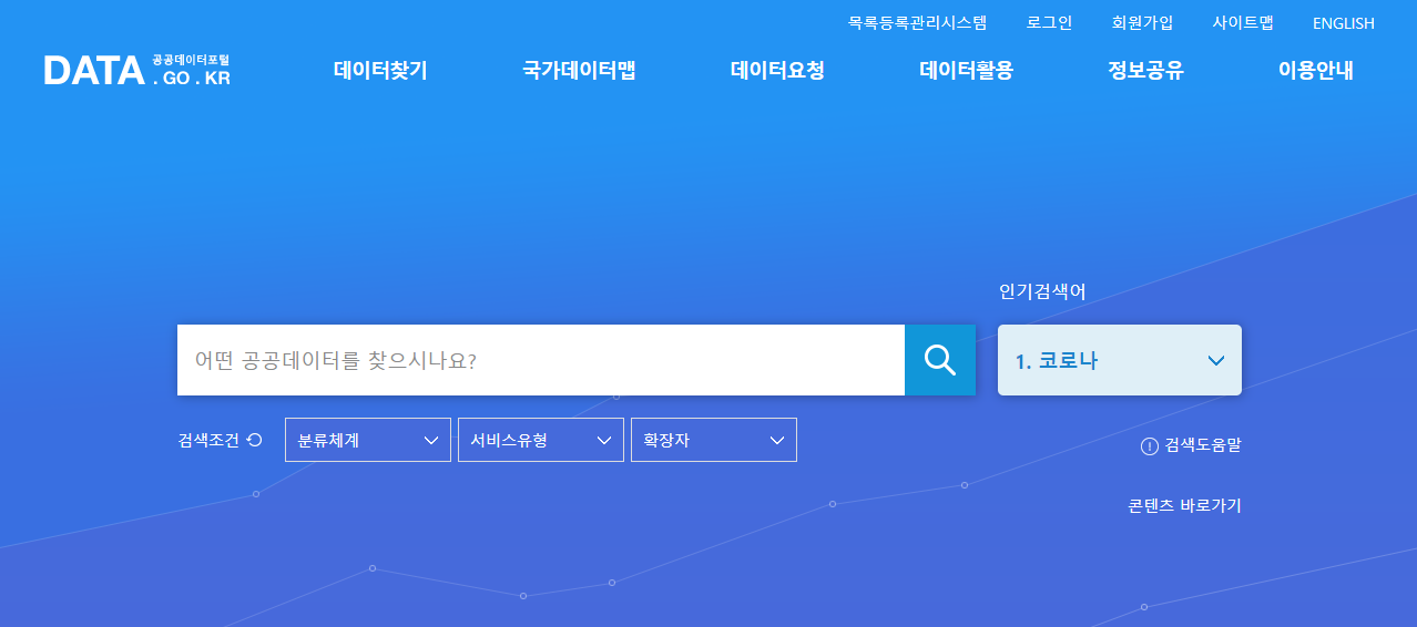 오늘은 우리나라에서 제공하고 있는 이 공공데이터(Open Data, Public Information) 포털을 소개하려고 합니다. 공공데이터란 공공기관에서 공적으로 만들어내는 모든 자료 및 정보, 국민의 소통과 협력을 위한 공적인 정보들을 의미합니다. 공공기관에서 보유하고 있는 데이터를 국민에게 개방하는 사이트가 바로 공공데이터 포털입니다. 포털은 공공기관의 자료와 데이터를 하나로 통합하는 창구이며, 누구나 이용할 수 있습니다.