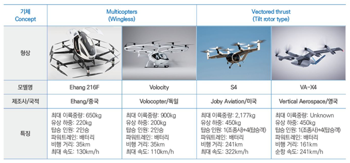 해외에는 중국의 이항(Ehang), 독일의 볼로콥터(Volocopter) 등 멀티콥터가 있으며, 해당 UAM은 날개없이 로터로만 이동합니다. 이에 반해 미국의 조비(Joby)가 제작한 S4나 영국의 버티컬 에어로스페이스(Vertical Aerospace)등은 날개가 있으며 틸트로터(Tilt rotor) 형태로 기존 항공기에 헬리콥터처럼 수직과 수평이착륙이 가능하도록 설계되었습니다.