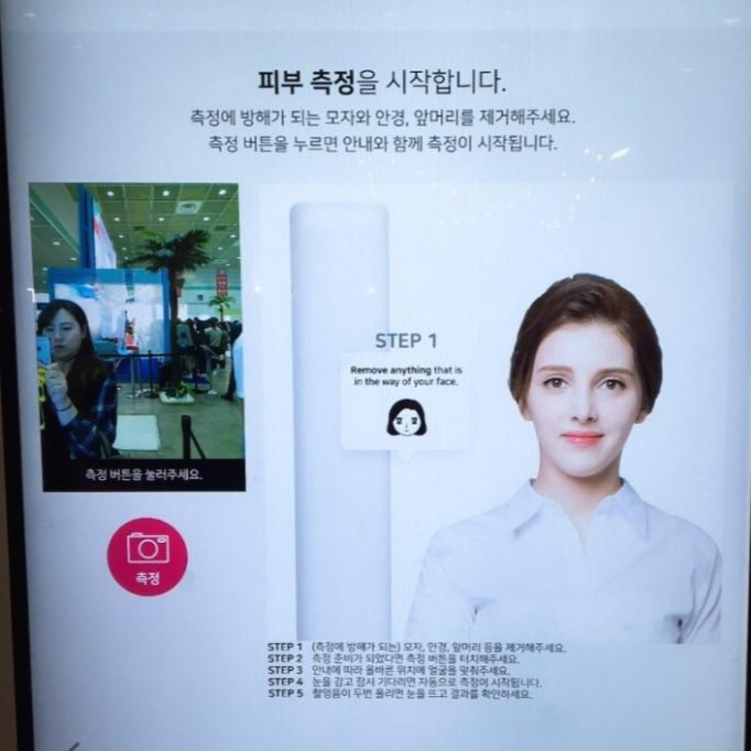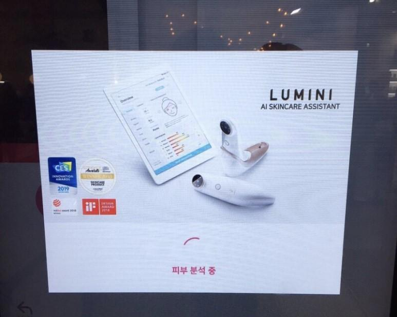 퍼스널 컬러존과 마찬가지로 한 번의 사진촬영으로 나의 피부나이를 진단해주는 빅데이터 기반의 인공지능 피부비서 ‘루미니(Lumini)’ 가 소개되고 있었습니다. 그동안은 피부나이를 진단하고 나의 피부의 약점, 그에 맞는 화장품과 대처방안을 알기위해서 많은 시간과 돈이 필요했는데요. ㈜룰루랩의 루미니는 인공지능 기반 실시간 얼굴 검출 및 조명 보정 기술을 활용해 단 한번의 촬영으로 얼굴 전면을 구역별, 그리고 피부 속까지 정확하고 빠르게 측정해줍니다.