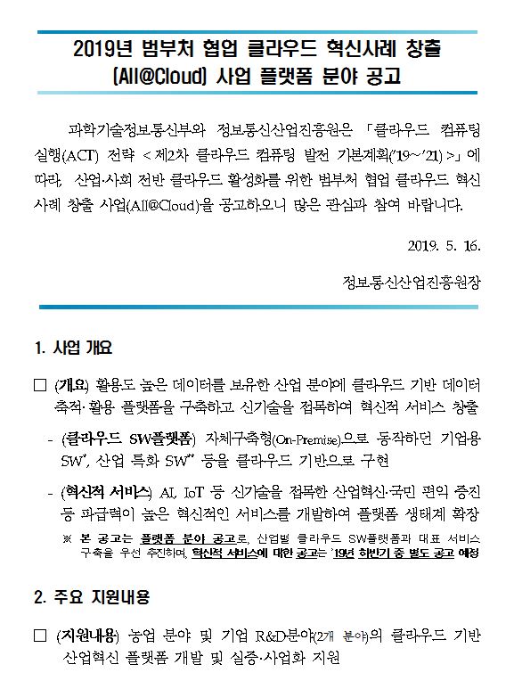 2019년 범부처 협업 클라우드 혁신사례 창출 사업 플랫폼 분야공고