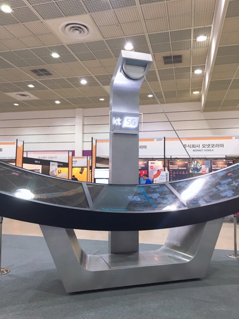 KT는 5G가 만들고 있는 미래의 새로운 세상을 제시하고 있었습니다. 전시장 입구에는 커다란 5G진자가 눈에 띕니다. `초세상, 기술로 하나가 됩니다`인 주제에 맞게 KT의 5G진자의 움직임에 따라 화면이 실시간으로 움직이면서 5G가 보여주는 초고속 초연결 초저지연을 보여주고 있었습니다.