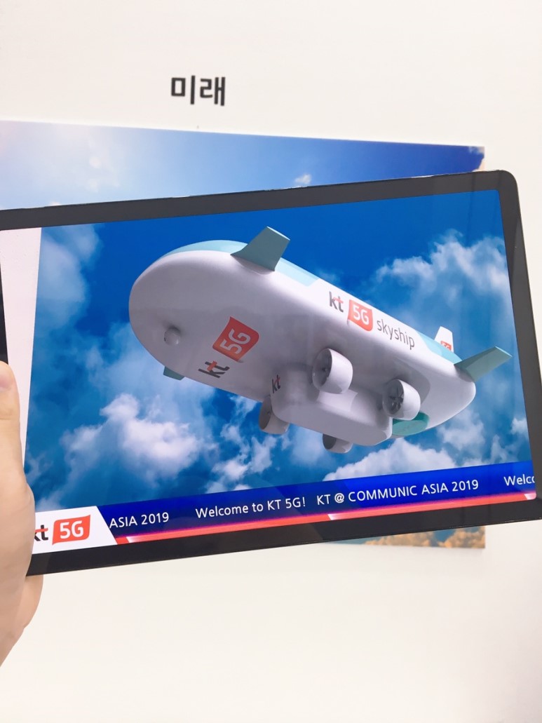 전시품목중 KT의 스카이쉽은 세계 최초로 5G통신과 무인비행선 및 드론의 장점을 결합한 재난안전 특화 플랫폼으로 5G를 이용해 사람을 구조하고 살리는 기술입니다. 이는 헬륨가스 기반의 기체로 다양한 환경에서 안정적 임무를 수행할 수 있어 드론의 단점인 비행거리, 비행시간, 탑재무게 등의 제한을 극복할 수 있다고 하는데요.