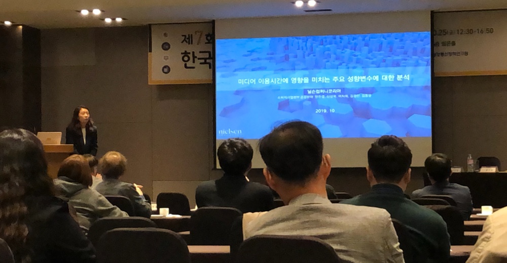 세번째 발표는 미디어 이용시간에 영향을 미치는 주요 성향 변수에 관한 연구는 닐슨코리아에서 진행해 주셨는데요, 연령대별 분석, 특히 50대 이상 인구집단과 50세 이하 인구집단에서의 미디어 이용 시간에 관한 분석을 진행하고 그 특징에 대해서 설명해 주셨습니다.