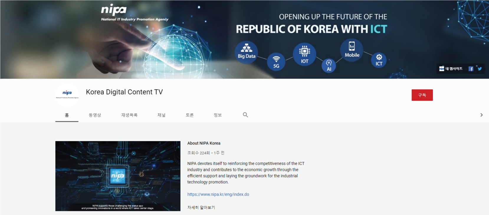 NIPA 지원사업과 연계하여 우수 콘텐츠의 해외 기업·투자자 대상 집중 홍보지원을 목표로 하는 'Korea Digital Content TV' 유튜브 채널이 개설되었습니다.